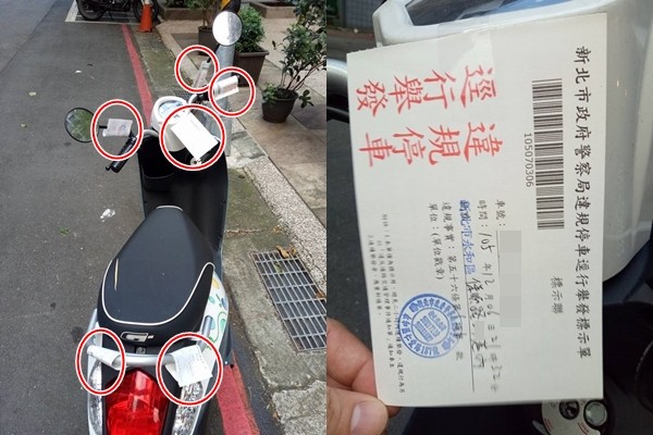 全貼滿了!新北市一名網友在臉書爆料公社PO文抱怨,日前他將機車違停在永和區保順路的巷內紅線上,雖然違停被開單正常,但是他的機車上的罰單數量卻超乎預期,幾乎能貼的地方都貼了,「我是有錯在先,被開單應該,但連續開成這樣是不是太誇張?」
