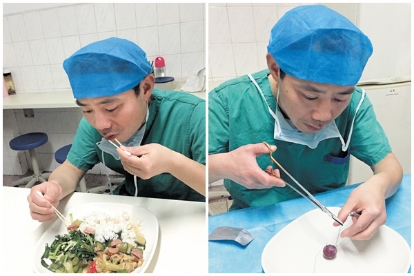 周建波表示,身為一名外科醫生,手術精準度全看手指的靈活性。用細小的棉花棒吃飯,可以達到鍛鍊手指目的,「因為東西越小,動作要求越精細」。