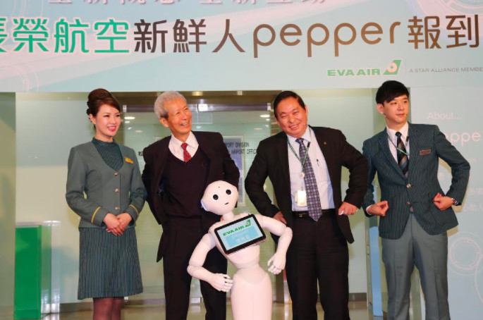 長榮航空宣佈將引進人形機器人Pepper,台北航空站朱耀光主任、長榮航空機場本部陳有玉副總經理也於松山機場親自歡迎這位活力十足的生力軍,Pepper將自明(8)日起加入服務旅客的行列,搭機旅客可於松山機場國際線櫃台及桃園機場貴賓室看見他的身影,這也是台灣航空界首批加入航空服務的機器人。