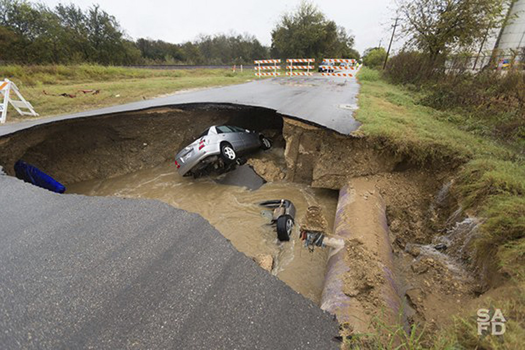 美國德州聖安東尼奧市(San Antonio)近日正在進行下水道維護工程,但過程中疑似施工不慎,導致一處路面於4日傍晚發生塌陷,形成一個深達3.6公尺的巨大坑洞,且底下充滿著大量汙水。當時有2輛車行經該處,卻因閃避不及遭到「吞噬」,隨即被泥水淹沒,造成一名女儲備警長死亡,另一人受傷。