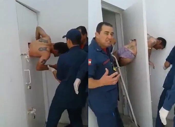 巴西一名嫌犯被關進警局的拘留所內,他異想天開想利用大門送餐的小孔逃跑,沒想到身體竟卡住了!狼狽的他痛苦萬分,甚至不斷發出哭叫,引來警察的注意,最後只好請來來消防員,將門鋸開,才將他「拔出來」。