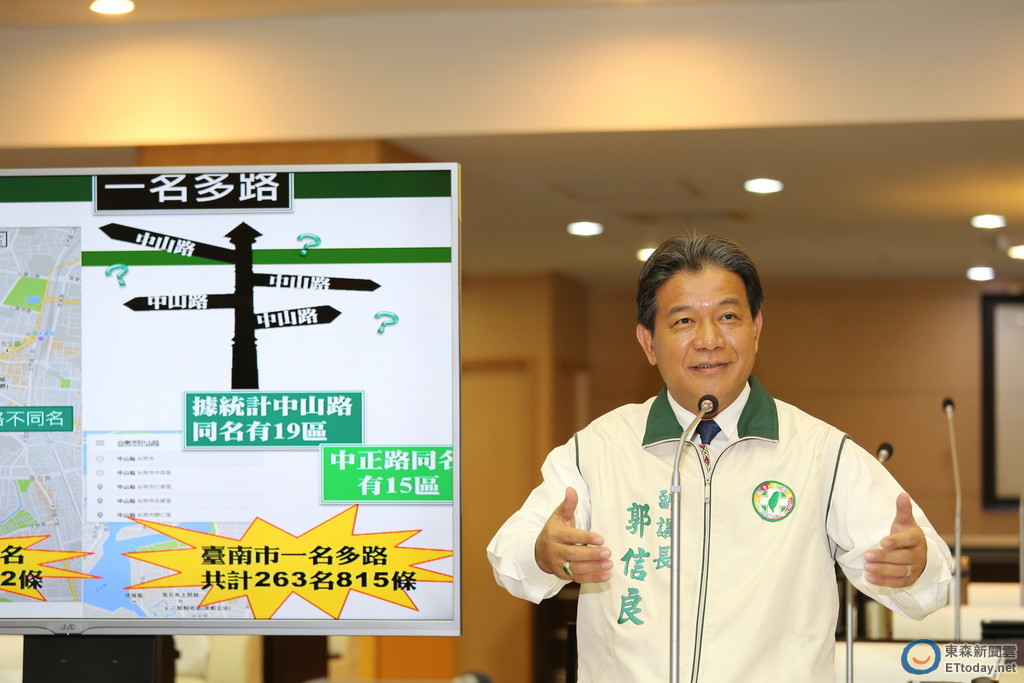 ▲台南市副議長郭信良,針對全市路名重複,呈現一路多名、一名多路情形,抨擊民政局何以都不整併。(圖/市議會提供)
