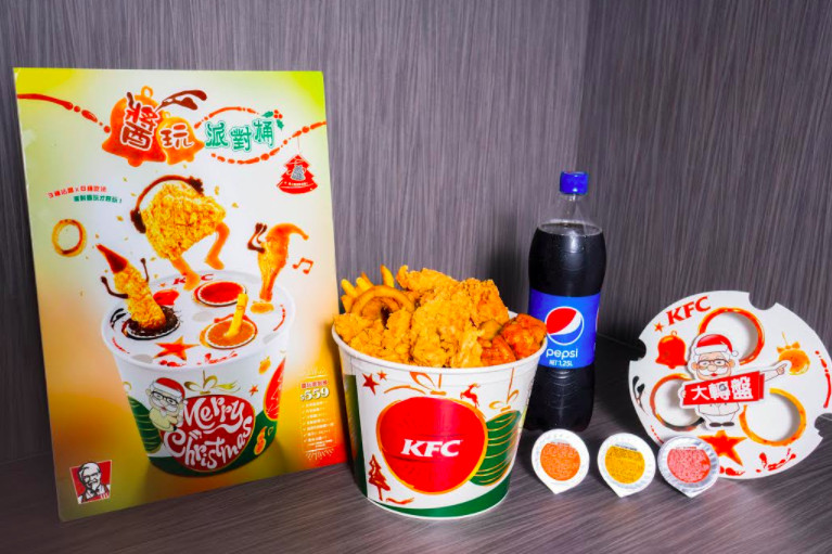 肯德基新品「醬玩派對桶」餐點內容包含:無骨金黃脆腿條、咔啦脆雞、紐奧良烤雞翅、香酥脆薯,以及洋蔥圈,5種炸物讓消費者依照喜好搭配3款沾醬,像是日式橙汁糖醋醬、美式煙燻醬、南洋酸辣醬,每桶售價599元。另外,即日起至12月12止,只要前往肯德基FB粉絲專頁留言,並標記三位好友,即有機會到門市免費品嚐一份醬玩派對桶。