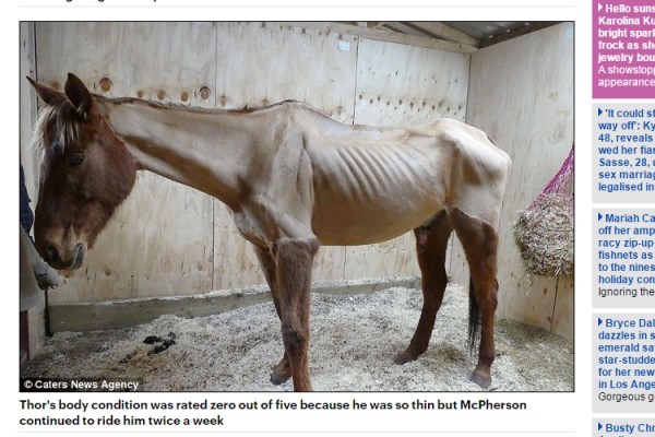 根據《每日郵報》(Daily Mail)報導,現年22歲的胖妹麥克福森(Charlotte McPherson),她飼養了一匹純種的特洛伊馬,名字叫做索爾(Thor)。今年3月她帶著索爾參加一場騎馬活動時,由於她用毯子將馬兒肋骨的部位蓋住,一開始沒人發現她的虐馬的惡行,直到她下馬時毯子被拿下,大家才驚呼連連。