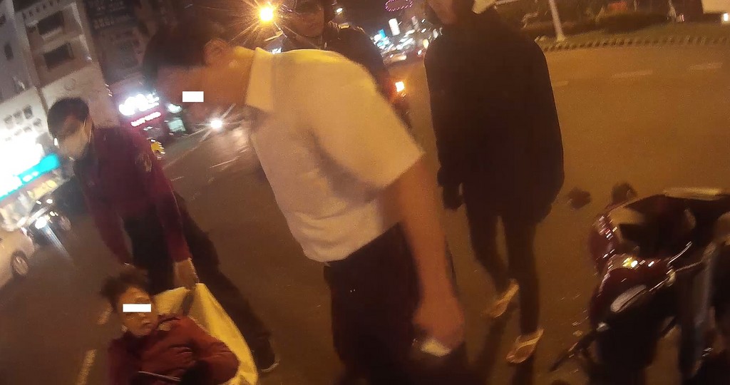 救護人員發現受傷騎士雙膝疼痛,且右膝一處撕裂傷,右手腕腫痛,立即給予清洗傷口包紮止血,由救護人員和熱心情侶協助把她搬運到救護車,後送到醫院診治,詳細車禍肇事原因由警方調查中。