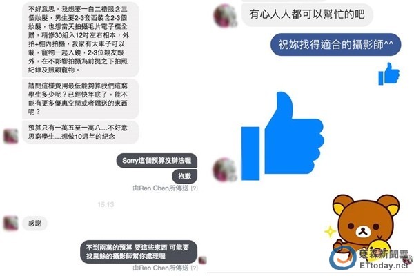 對方傳來的訊息中,拍攝細節部分設想的相當周到,連出外景用的車都已備好,顯然做過許多功課,但對方接下來傳的訊息卻讓任哥傻眼,「這樣費用最低能算我們窮學生多少呢?快年底了,能否有更多優惠或贈送東西?預算只有1萬5至1萬8,不好意思窮學生,想做10週年的紀念。」