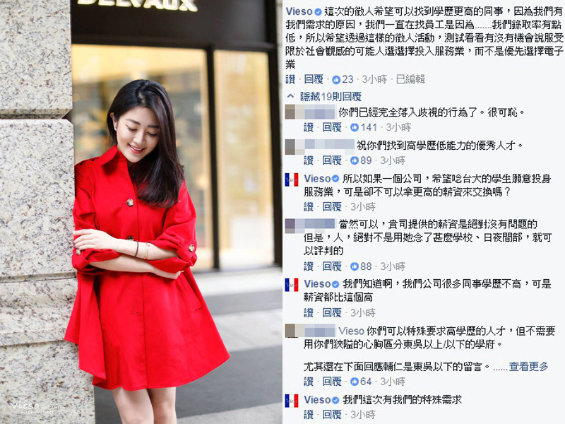 今年(2016)10月才因「關於Vieso不提供女性商品給男性顧客試穿的原因」引爆戰文,台灣服飾品牌Vieso粉絲專頁惹出「男人內褲有尿痕」的歧視爭議後,9日下午4時許又發文「Vieso徵高級銷售專員」,條件學歷為東吳大學以上,且只接受日間部,不接受夜間部,疑似刻意引戰、營造討論,再度引爆網友怒火!