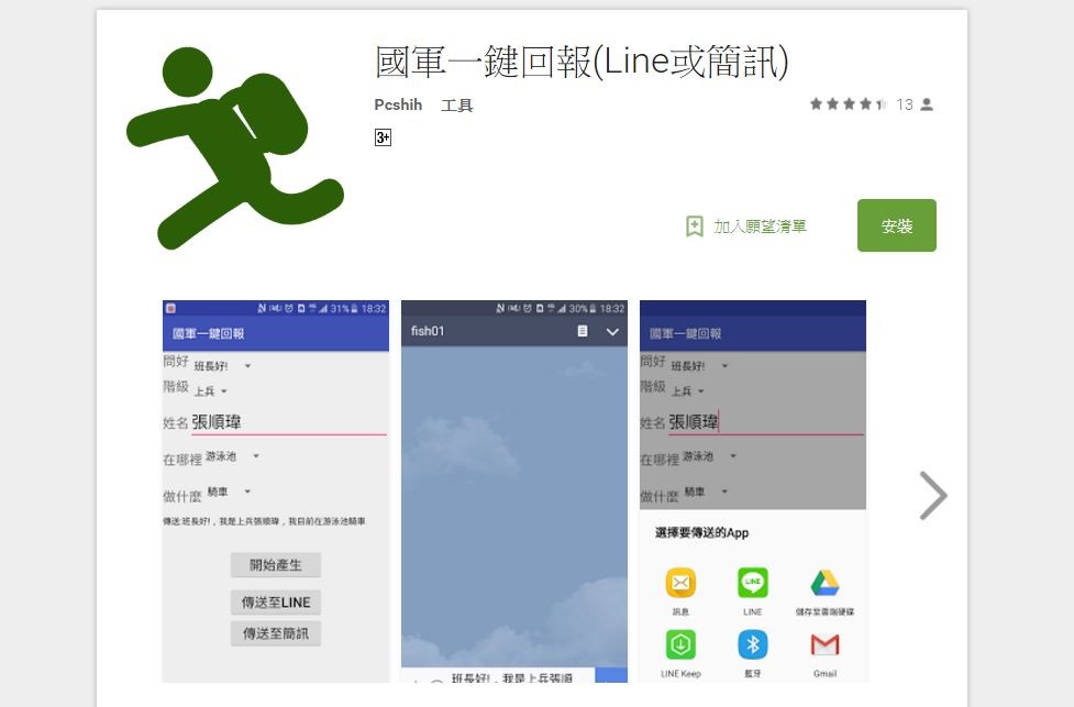為了不浪費役男寶貴的休假時間,這款APP不但能一鍵產生回報說詞,還可以選擇要透過簡訊、LINE或是臉書聊天室,將訊息傳送給特定對象。方便的是,只要使用過一次,APP就會自動記憶姓名、級職及問候語,所以之後也不必再重新選擇;儘管APP目前僅供Android用戶下載、使用,許多功能也還並不完善,但設計構想仍受到許多人熱烈支持。