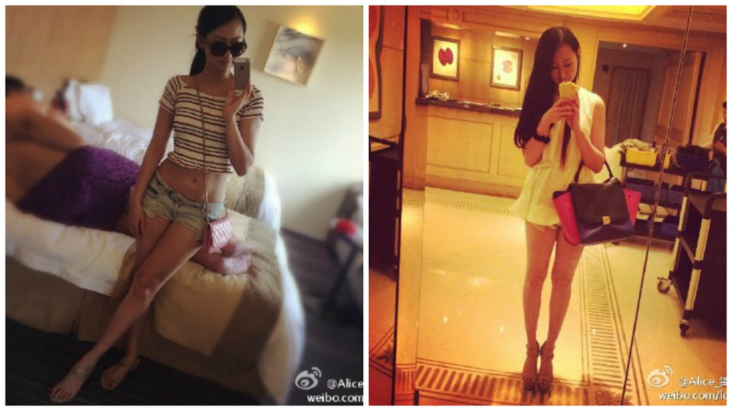 Alice鮮少在臉書PO文,原來將重心放在微博,上面滿滿的美腿照,以及高檔美食照,像是如絲葵牛排、「30萬日圓的吉兆割烹壽司」、還有土豪哥直送東吳的愛心添好運午餐,就要3000多元,另外就是滿滿的名牌包照,舉凡PRADA、愛馬仕、鑽錶、鉑金包,還有土豪哥「一早就有驚喜包」的FENDI包,不過土豪哥入鏡的照片極少,並不常放閃。