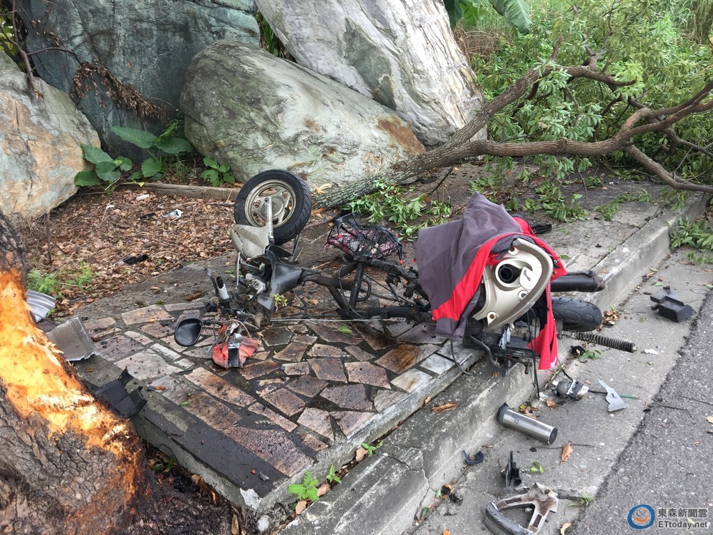 車禍現場肇事的白色小客車車頭幾乎全毀,安全氣囊也彈出爆開,地上血跡斑斑及破碎車殼,加上長達百公尺的剎車痕與5棵路倒樹,場面怵目驚心。