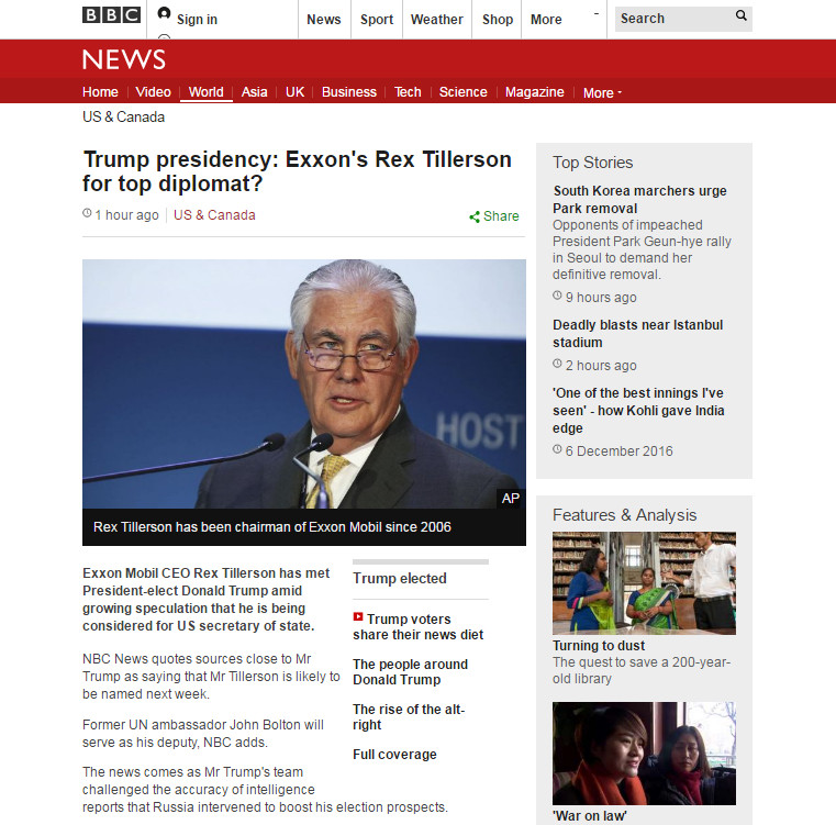 報導指稱,川普幾個星期下來,一直都在尋找具備外交手腕的人才,來回檢視著幾十位擁有不同意見和背景的人選。根據執政交接團隊官員說法,川普最終把目標鎖定在提勒森身上,雖然還沒正式對外公布,但幾乎就是他了。