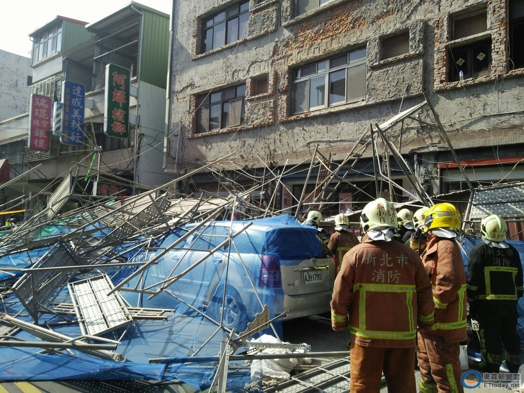 新北市泰山區明志路一段一幢5層樓的老舊公寓正進行外牆拉皮工程,不料,13日中午11時39分許卻發生鷹架倒塌意外,現場2名正在施做工人目前仍失聯中,附近1部汽車則遭壓毀,警消到場搜救並未發現人員受困,2工人疑似自行已就醫正由雇主連絡中,另有3騎士也受輕傷自就醫,公所已調派大型機具到場處理。