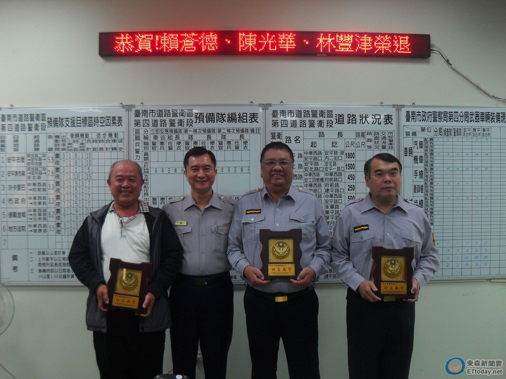 台南市警四分局12月份有3名員警光榮退休,告別30年的從警生涯,四分局於12月份分局週報勤教時段,舉辦歡送會並頒贈紀念品給3名榮退同仁,感謝3名員警對警界付出的貢獻,同仁紛紛予以道賀、祝福與依依不捨,場面溫馨感人。