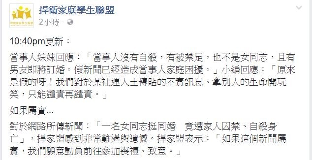 捍家盟粉絲專頁小編眼見網友戰成一團,無奈地回應「看到許多人留言回覆,小編想說『反對也不行,釋出善意也不行,到底想怎樣啊…』」但仍無法平息眾怒。貼文發布後不久,捍家盟隨即更新貼文,表示已接獲當事人妹妹的回應,澄清當事人沒有自殺,也沒有被禁足,而且即將與男友訂婚,並非是女同志,現在假新聞已經造成當事人困擾,期盼某社運分子別再轉貼不實消息。