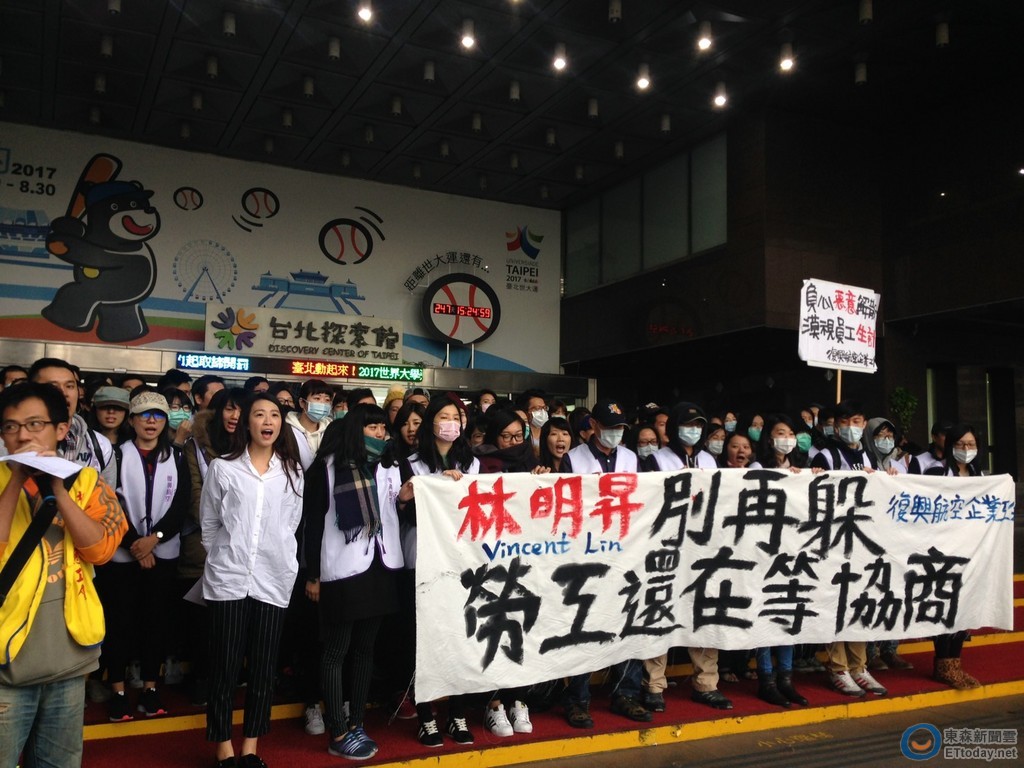 復興航空日前無預警解散後,勞資雙方14日於北市府展開第二次強制協商,而會議開始前,上百興航員工一早便到北市府前集結,高喊「林明昇別再躲」,並提出董事長林明昇出來面對、興航提供財報、合理計算資遣費等訴求,並表示將靜坐到協商結束。復興航空企業工會副理事長龐閔憶也再次重申,只要資方拿出談判誠意,工會開出的條件也有退讓協商的空間。