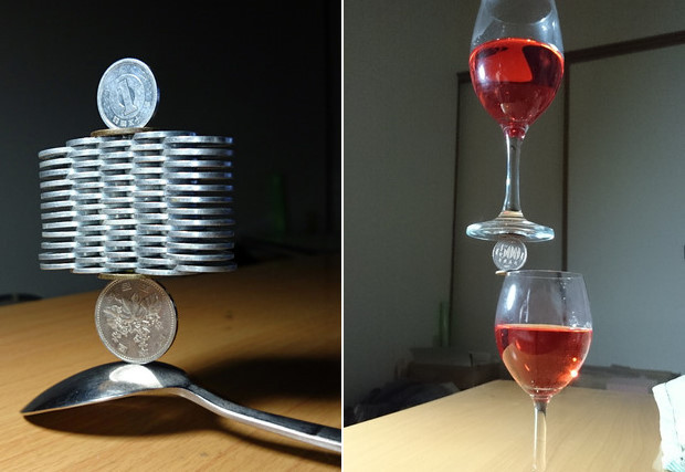 日本推特用戶「Thumb Tani」經常在網路上分享自己的堆硬幣絕技,他可以利用酒杯、湯匙甚至是剪刀,結合硬幣創造出各種不可思議的驚人造型!