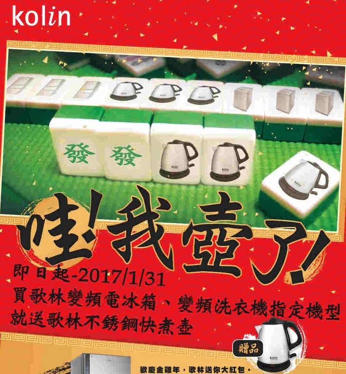 歌林特別推出「我壺了!」回饋專案,歡慶金雞年:消費者只要於活動期間2016年12月1日到2017年1月31日,購買指定歌林變頻電冰箱、變頻洗衣機任一指定機型,再加送歌林不銹鋼快煮壺。