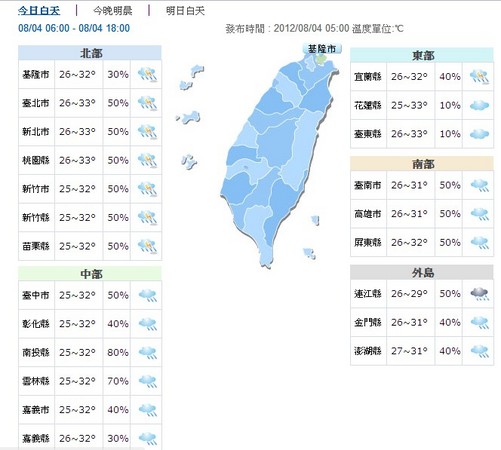 中央氣象局發布大雨特報,由於對流雲系發展旺盛,4日南部地區有局部大雨或豪雨發生的機率;午後中部以北山區有局部大雨或豪雨發生的機率,請注意瞬間大雨、雷擊及強陣風,山區請慎防坍方、落石及瞬間大雨;低窪地區請慎防淹水。