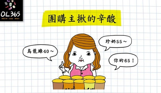 網路插畫團體「OL 365」日前以團購主揪為主題,繪製一張插圖,圖文分享關於團購主的辛酸血淚,引發網友共鳴。圖片以兩格漫畫方式呈現,圖中可見,擔任團購主揪,不但要幫忙大家統計彙整,還要幫忙計算總金額。