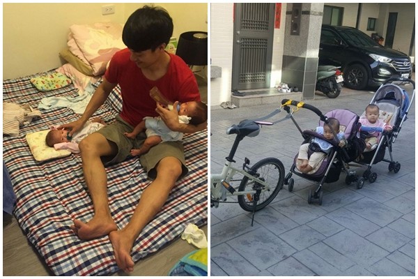 小孩子出門也是大問題,石君摩改造2台娃娃車與腳踏車,自製成可愛的聯結車。此外,他利用背巾加上掛勾,揹著寶寶成了袋鼠男人,等小孩睡著後,左右手各提一個,輕輕地掛在嬰兒床欄杆上,猶如還在爸爸的襁褓中。