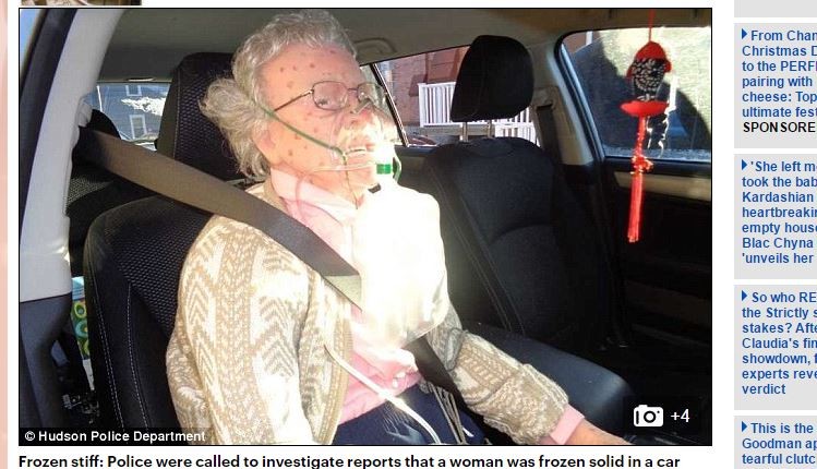 根據《每日郵報》報導,哈德遜(Hudson)警方深夜接到通報,指稱有名老婆婆受困車內,帶著氧氣罩動彈不得,恐是天氣寒冷,導致老婆婆早已「凍死」。當局隨即派人前去救援,發現一名戴著氧氣面罩、穿著粉紅襯衫、滿臉老人斑的老婆婆張著嘴坐在車上一動也不動。