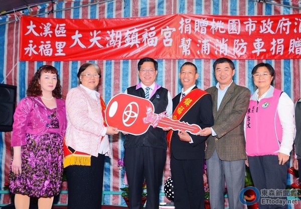 桃園市長鄭文燦18日出席「大尖湖鎮福宮捐贈幫浦消防車儀式」時表示,鎮福宮在建廟完成後,將多餘善款捐出,捐贈價值170萬元幫浦消防車,將由消防局大溪分隊使用,讓消防兄弟不僅在救災時能挽救更多生命,也能保護執勤同仁安全。