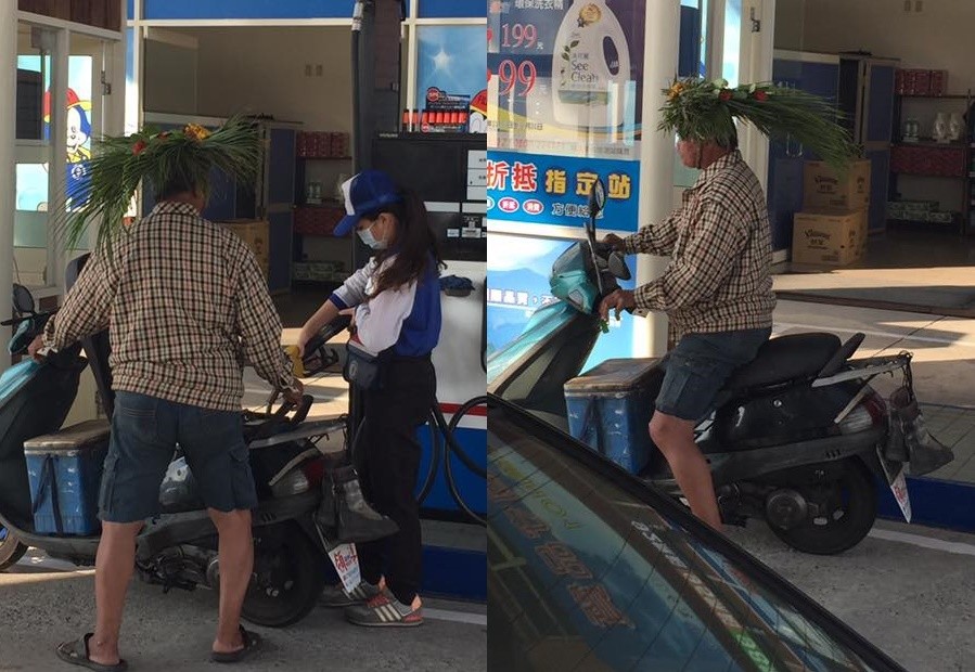 高雄一名機車騎士在加油時,頭戴一頂用草編織而成的安全帽,完全不在意別人的眼光,神情從容的在加油站加油,畫面相當有趣。這一幕被網友捕捉到,並上傳至臉書「爆料公社」,引起熱烈的討論,不少網友大呼「這也太潮了吧」,還有許多人紛紛表示,「上次我也看過他」。