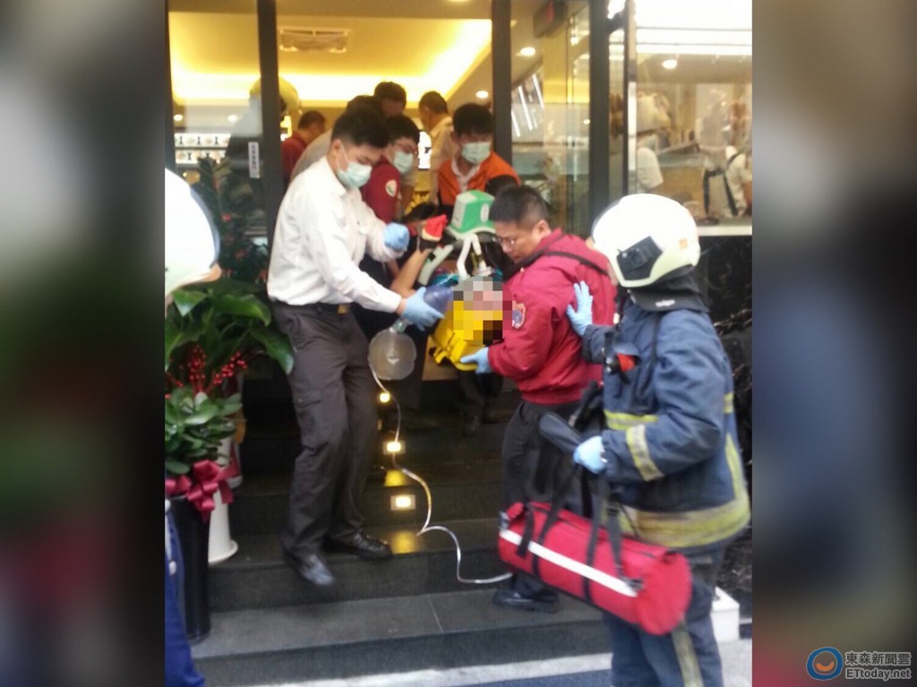▲頭部受困貨梯內女子被消防人員救出。(圖/記者楊佩琪翻攝)