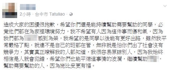 少年的阿姨表示,針對引起各方關注一事,希望自己能代姪子向學校及老師道歉,而目前為了保護孩子,已經先請姪子刪除臉書文章;但今天這件事,若以一個旁觀者的角度來看,張姓少年只是一個還在青春期的孩子,教職人員或許不該以公開的方式提醒。
