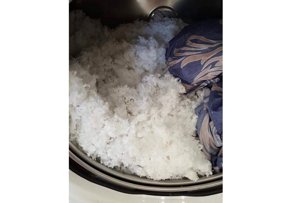 網友在「爆廢公社」貼文表示,「我的枕頭是長條型的,它髒了...老婆拿去外面自助洗衣,就這樣整條丟進去,接著就...」,只見棉花全迸出枕套外,乍看之下,還以為是一大鍋白飯呢!