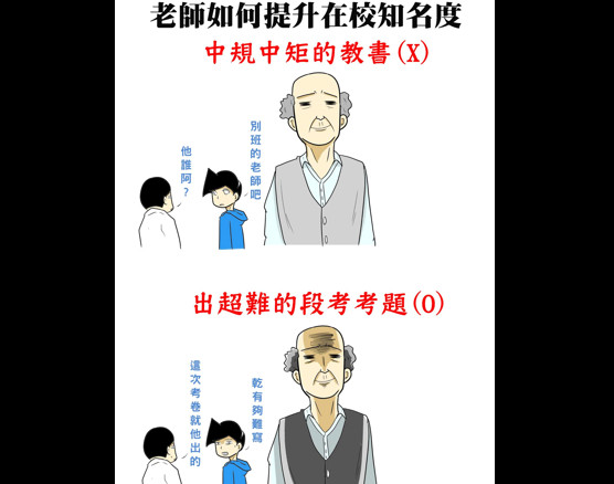 上方的圖文中提到,老師要如何提升在校知名度呢?只見一名學生問說「他誰阿?」,另一名同學則回應「別班的老師吧」,由此可見,中規中矩教書的老師是絕對不會讓學生記得的。而在下方的圖文中,2名學生正在討論這次段考題目有夠難寫的,馬上肯定地指出這次題目就是「他」出的,想要讓學生們記住的話,出超級難的段考題目就對了。