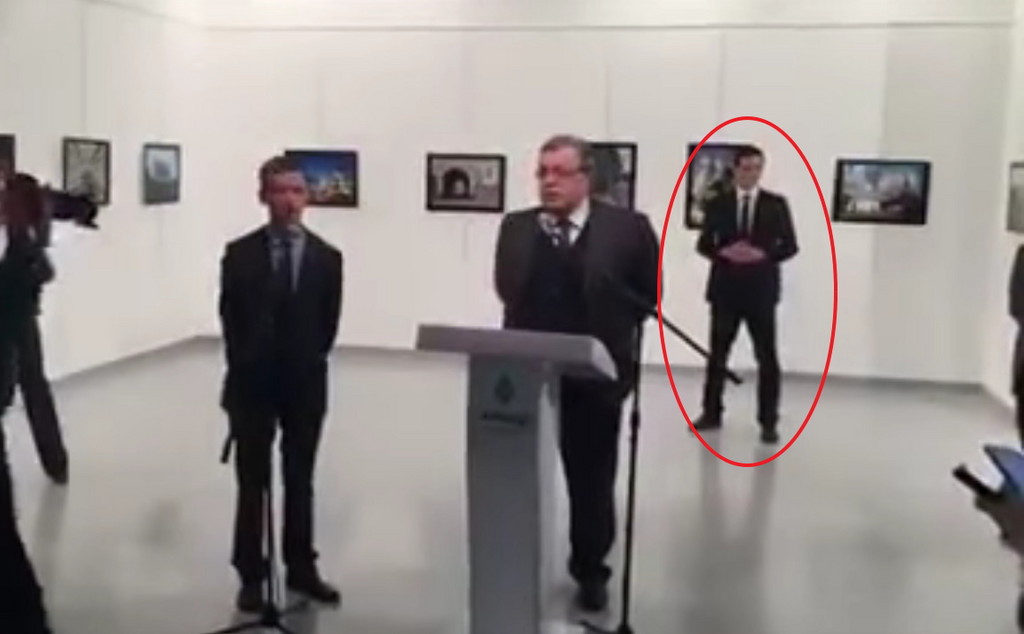 俄國駐土耳其大使卡羅夫(Andrey Karlov),19日晚間在安卡拉一場攝影展遭刺殺,槍手阿爾丁塔斯(Mevlut Mert Altintas)行兇前的影片現在也曝光,影片中可見,槍手當時混進展場假裝欣賞作品,冷靜的在死者身後踱步,還不時調整衣著和槍套,接著突然掏出手槍射擊。