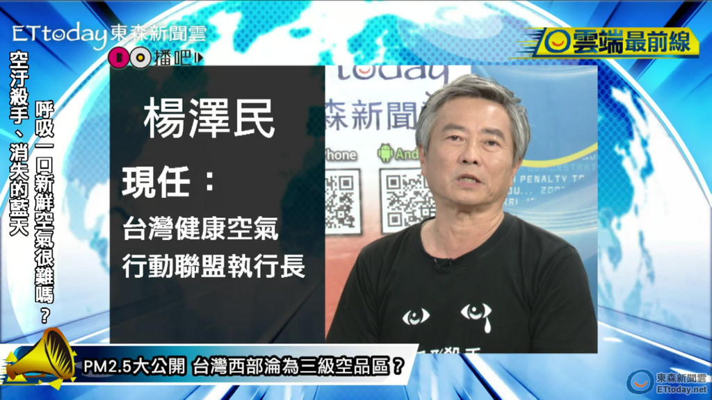 今日的「雲端最前線」以「空汙殺手、消失的藍天」為主題,邀請了楊澤民博士、環保署空保處副處長謝銘輝和立法委員劉建國,共同討論空汙趨勢和空氣品質指標AQI新制等相關議題。