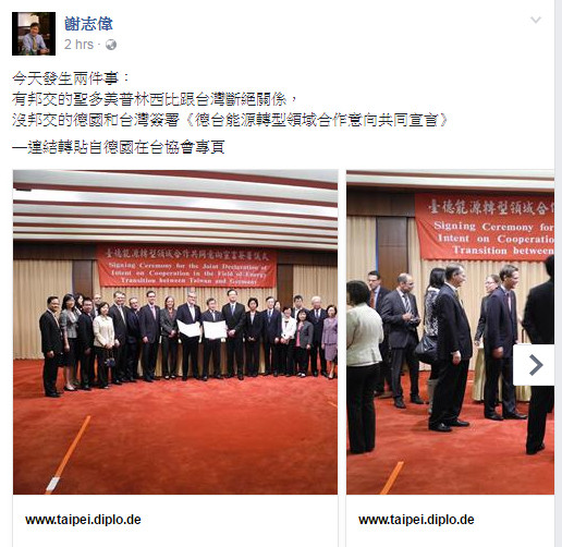 ▲德國21日與台灣簽署《台德能源轉型領域合作共同意向宣言》。(圖/翻攝自謝志偉臉書)