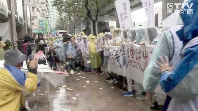 復興航空企業工會今(22日)在風雨中走上街頭,500多名員工至興航相關企業國產實業大樓砸雞蛋、撒冥紙,表達強烈不滿,並遊行至總統府前抗議,盼蔡英文出面回應。