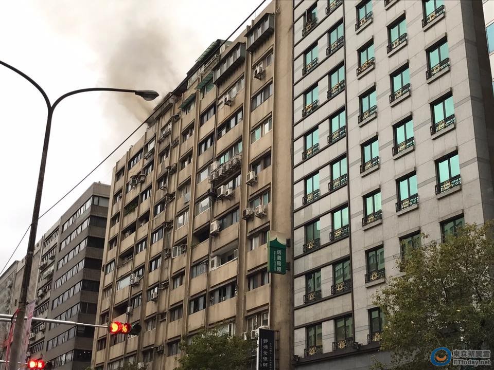 台北市東區忠孝東路4段英倫大樓22日下午3時許發生火警,頂樓冒出陣陣濃煙,目前消防員已抵達現場救援,路過民眾也紛紛拍照上傳網路。