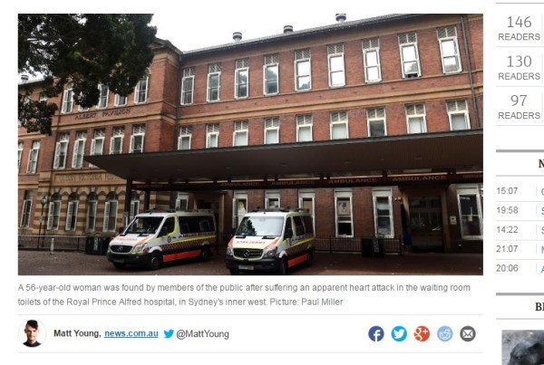 根據《https://www.news.com.au/》報導,這名婦人原本在原本在皇家阿爾弗雷德王子醫院(Royal Prince Alfred Hospital)住院,11日清晨她準備辦出院手續,因為一時內急而到醫院內的廁所解決。只是時間過了約1個多小時,遲遲未見婦人蹤影。事後醫院清潔工人發現,她竟然倒臥在廁所內。