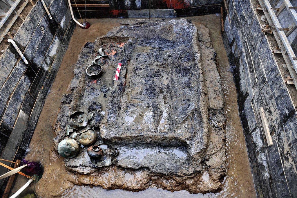 據《洛陽晚報》報導,此座墓葬東西長5.6米,南北寬4.4米,墓葬距離地面的深度為6.2米,被認定為擁有2600年歷史的陸渾戎貴族墓地,其中有一棺一槨,還有相當豐富的遺物,有銅鼎、簋壺、鬲、豆、戈、盤、玉佩、琮等,同時還有部分金器。