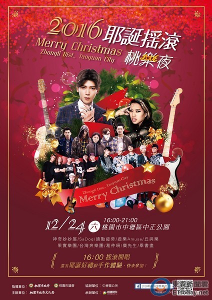 桃園市政府文化局22日指出,「2016桃園耶誕搖滾桃樂夜」演唱會,在12月24日平安夜下午4點至晚間9點,於中壢區中正公園熱力登場,現場10組表演輪番演出,還有300頂限量聖誕帽及手作體驗薑餅人,歡迎市民朋友踴躍參與,為溫馨的耶誕夜留下美好的回憶。
