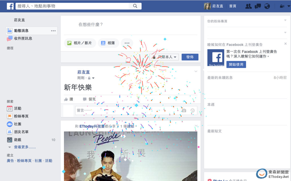 才剛推出佳節賀卡與手機 App 動態底色更換等小工具的 Facebook,近期也因應聖誕與跨年期間,除了針對通訊 App Messenger 加入定番的雪花動態之餘,只要在桌面版動態中輸入新年快樂,就會出現美麗煙火,趕快來試試看吧!