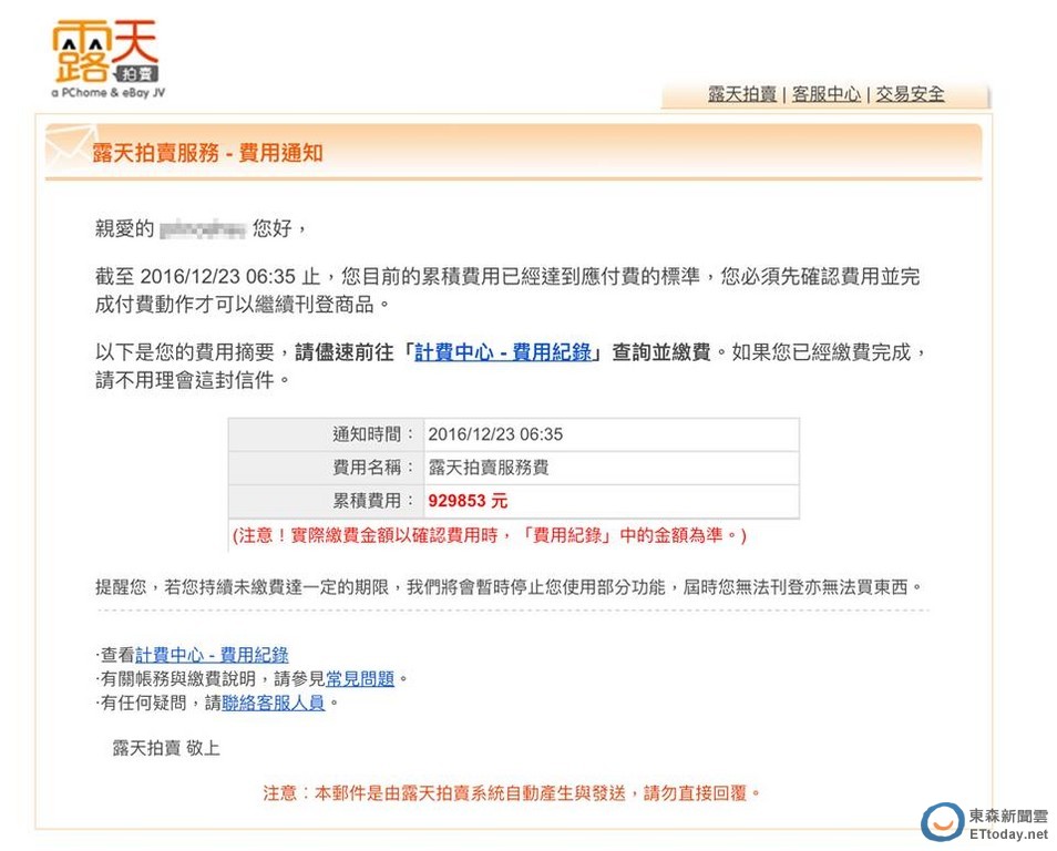 網路購物不僅方便又迅速,已經成為了許多人購物時的首選,也因此時常有資料外洩、帳號被盜用的新聞。台北徐先生9日發現,許久未使用的露天拍賣帳號突然有買賣紀錄,寫信給客服反映後,對方回信表示將進行停權,23日卻收到露天寄信要求支付929,863元手續費。
