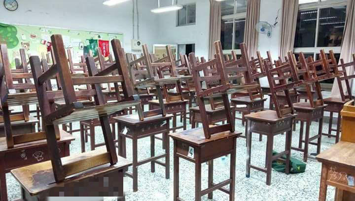 台中某家商在打掃時間將椅子反轉放在桌上,排成一系列向仙人掌一般的劍山,立在桌上的椅子僅用兩腳站立,看得網友讚嘆連連。