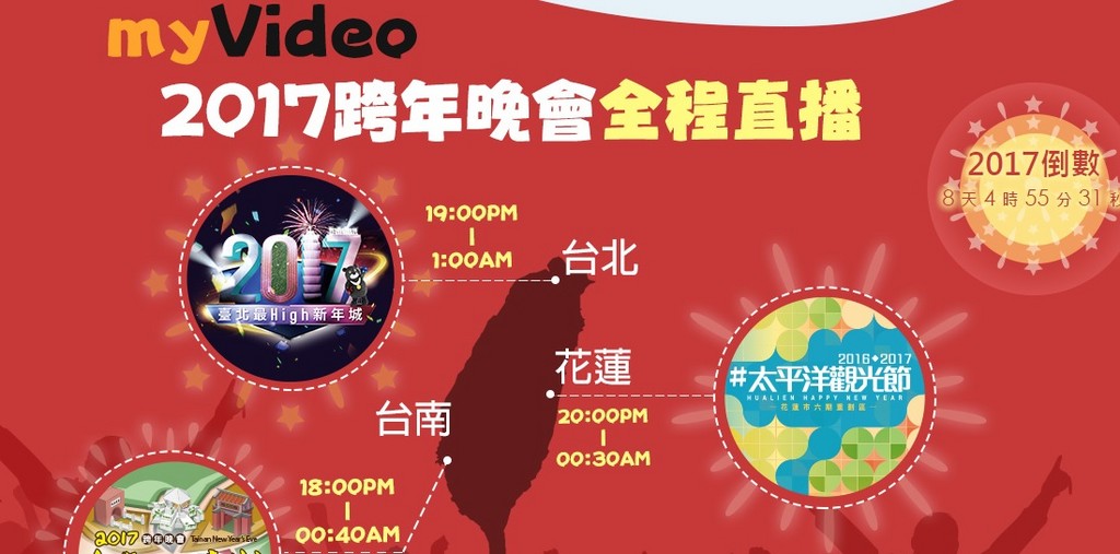 「2017即將到來,一年一度的全台跨年晚會進入倒數時刻!myVideo今年將同步直播「臺北最HIGH新年城」、「愛戀花蓮」及「台南心時代」三場跨年晚會。「2017臺北最High新年城」由曾國城、曾寶儀主持,三立電視將斥資千萬推出全台最炫跨年演唱會舞台,結合2017世大運元素,舞台並大走體育戶外風。