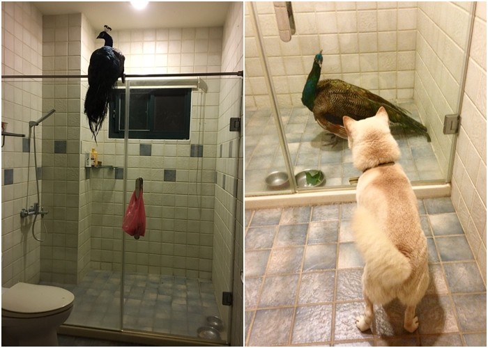他表示,孔雀因為跌落田旁邊的水溝,羽毛濕濕的,一路上都很乖,孔雀來了後,家犬「饅頭」每天守在廁所門外盯著孔雀看,狗狗沒有跟孔雀放一起,「我常常把饅頭趕出來,要牠別盯著人家」。「本來跟老爸計畫著將饅頭丟進廁所,讓孔雀在庭院踱步順便開個屏?但腦中浮現孔雀東南飛這句,上網Google後還是放棄了。」