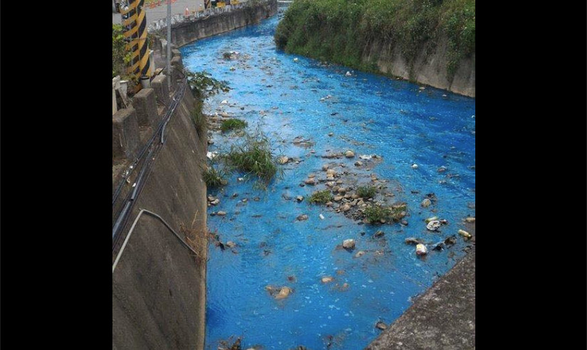 ▲敬鵬工業違法排放工業廢水,讓整條營盤溪被染成藍色(圖/翻攝自王定宇臉書)
