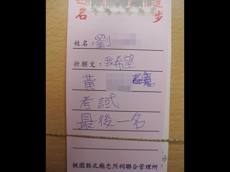 一名網友貼了一張桃園孔廟忠烈祠許願卡,不過上頭卻寫著劉xx希望黃oo考試最後一名。許多網友看了一秒笑出來,po文的網友也笑說「這個小孩......有前途」。
