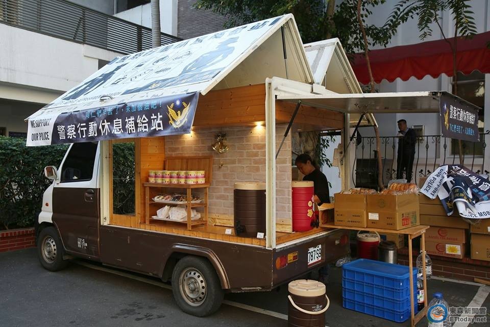 因警政署派出大批警力,警政署今天也首度派出「行動補給車」,今天8點30分起,分別於中山濟南,青島鎮江及康園餐廳前支援最前線的員警,提供三明治、水果、飲料等補給品。