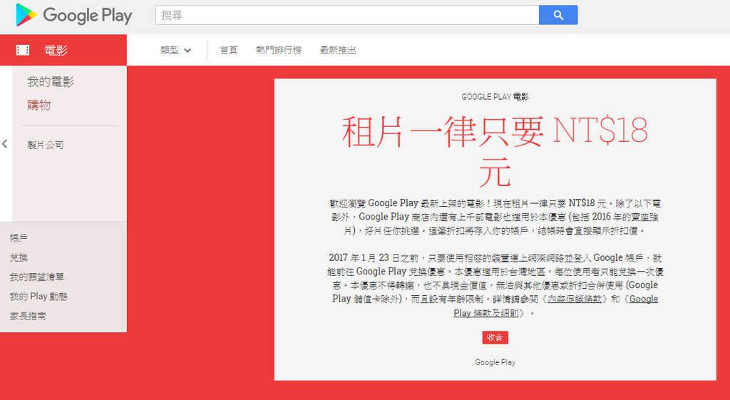 即日起至1月23日為止,Google推出「租片一律只要 NT$18 元」活動,只要登入帳號,就能夠前往Google Play兌換優惠,要注意的是優惠限台灣地區獨享,每位使用者只能兌換一次,而且設有年齡限制,部分影片無法適用。