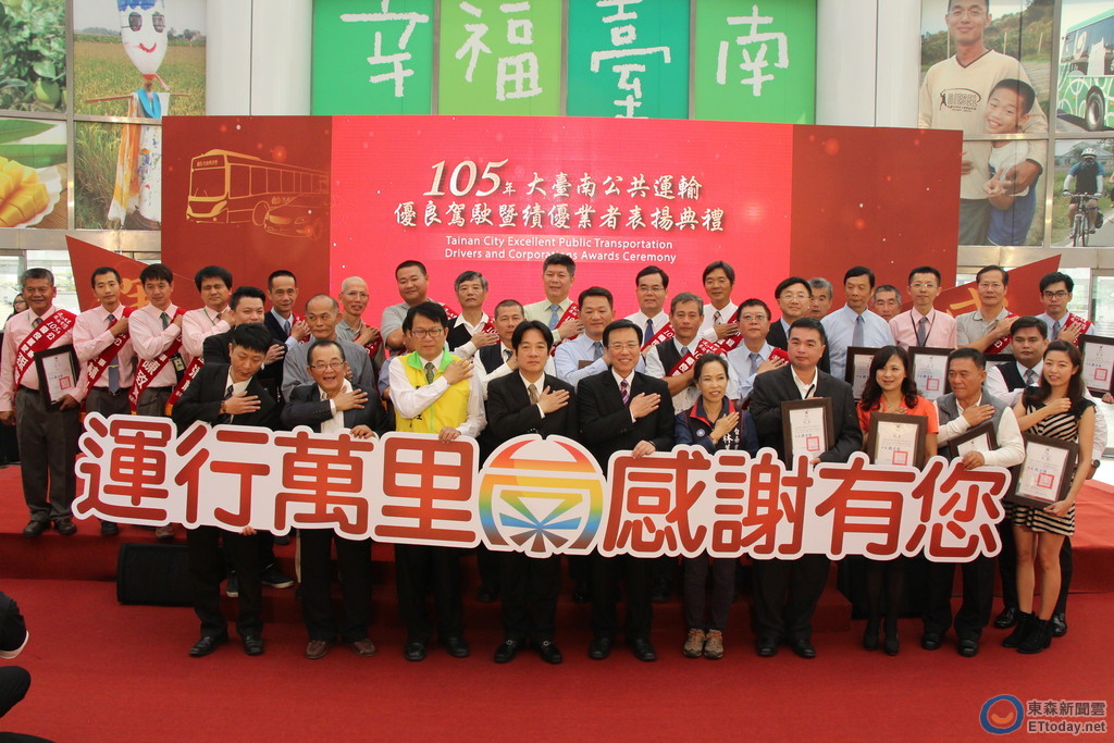 台南市交通局26日以「運行萬里感謝有您」為主題,表揚105年大台南公共運輸優良駕駛暨績優業者,由市長賴清德親自頒獎肯定駕駛朋友及業者的貢獻,期勉秉持「職人」精神,提供市民可靠貼心的公共運輸服務,場面隆重溫馨,陪同得獎者出席的家屬也與有榮焉。