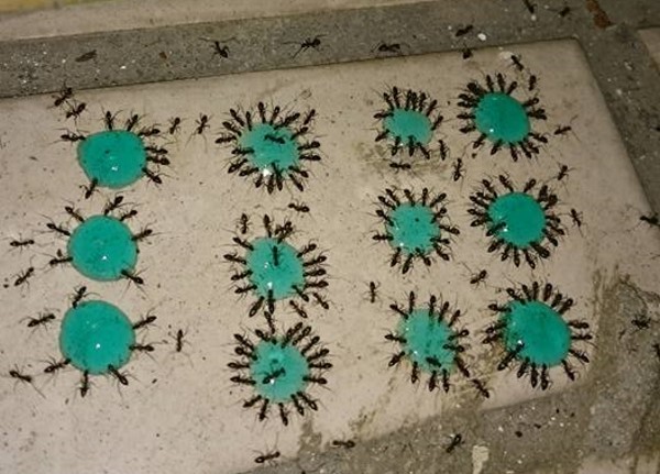 照片中,只見整群黑螞蟻分成「6桌」,平均每桌有快20隻,已經「爆桌」,牠們不知情地吃下藍綠色的「驅蟻劑」,一旁還有其他螞蟻陸續加入,就像是下班遲到趕著過來一樣。